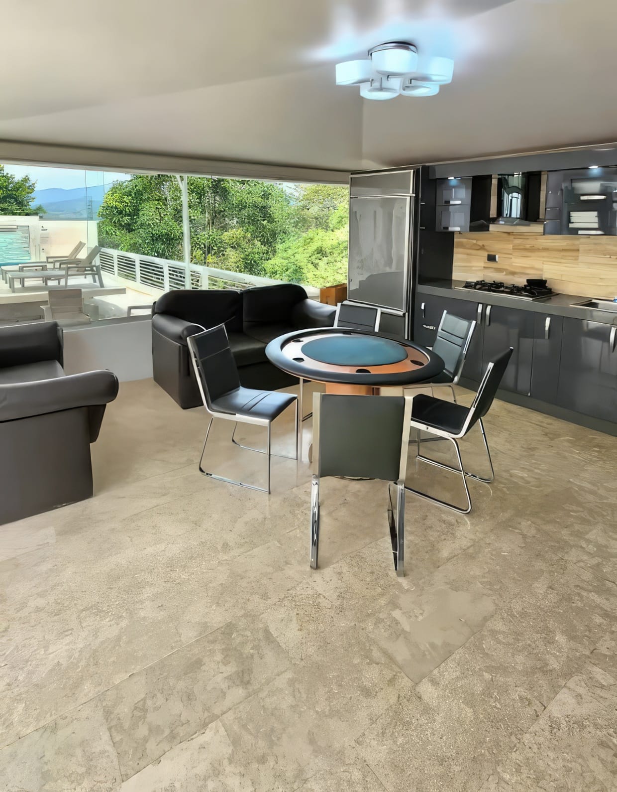 🔹️ Patio grande con area terrazeada, piscina con cascada y luces, área cerrada para reuniones con aire, y cocina empotrada totalmente equipada, jardines alrededores de la quinta.