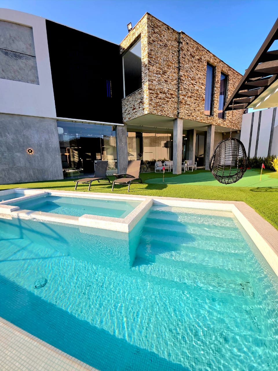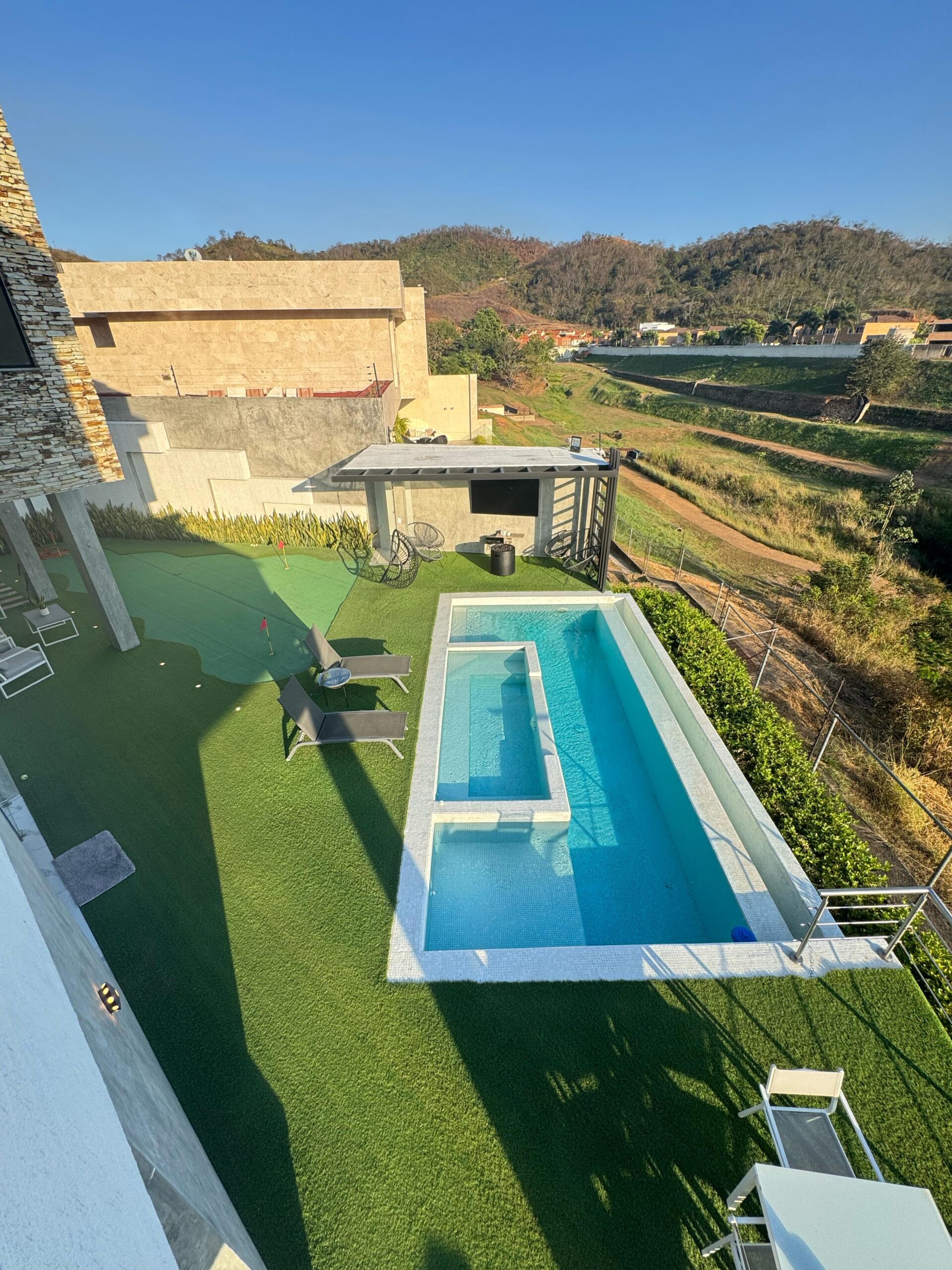 🔹 Bellisimo Gran Patio con Piscina sin fin y Jacuzzi, parte techada con zona de parrilladas, tipo estar, cuarto de maletero, y baño completo.