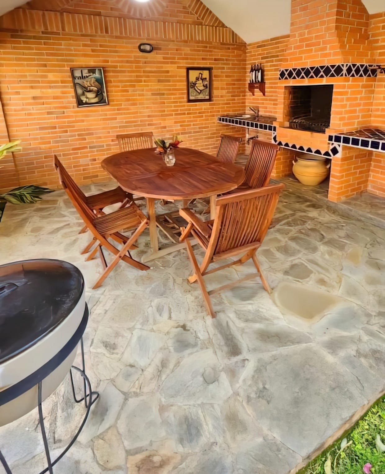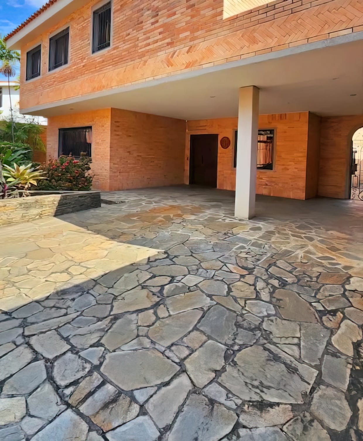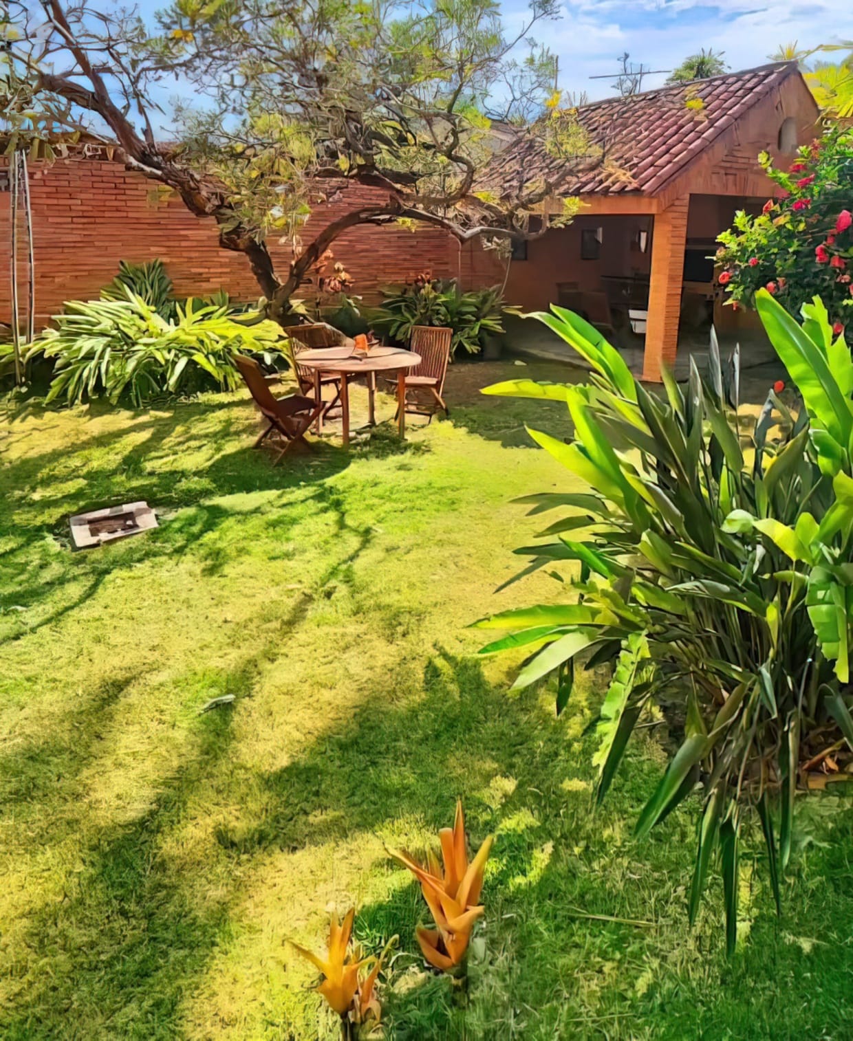 🔹️ Patio cómodo con maleteros, Pergola para reuniones y parrilladas, acceso directo rodeado de jardines para invitados.